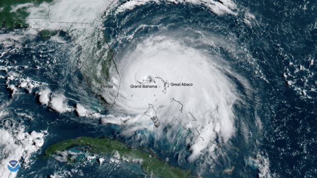NOAA satellite image of Hurricane Dorian over the Bahamas in September 2019. NOAA Environmental Visualization Lab.