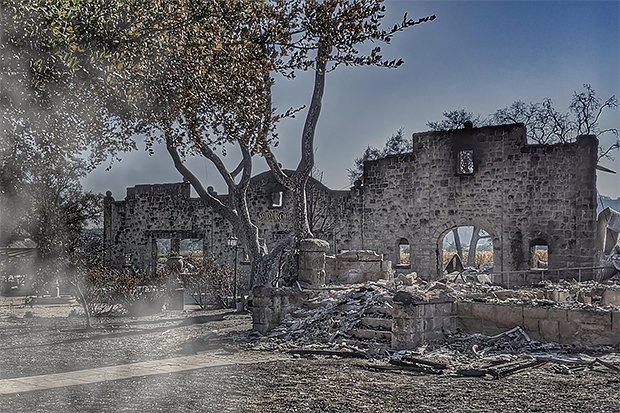 The remains of Soda Rock Winery, Jimtown, California, on November 2, 2019, after the Kincade Fire. Photo by Mark Gunn, used under a Creative Commons license.