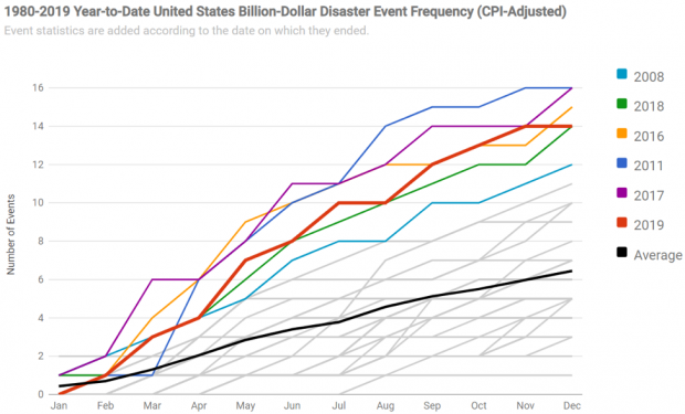 This graphic above shows the month-by-month accumulation of billion dollar disasters for each year on record. The value for a given year for a given month shows the total number of billion-dollar events that had occurred by that month in a given year. 2019 (thick red line) had the 4th highest total number of events (tied with 2018, green), following the years 2017 (purple), 2011 (dark blue) and 2016 (orange). Other years appear in gray. Note that there is considerable overlap, and some years' traces are obscured.