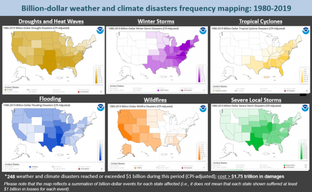 These maps show the number of times each state has been affected by each of six types of billion-dollar weather and climate disasters from 1980-2019. Note that each state did not necessarily experience the full billion-dollar cost for an event to be counted; it only needed to be part of a regional event that caused one billion dollars or more in direct damages. Screenshots from NOAA NCEI Billion-dollar Disasters webpage.