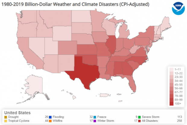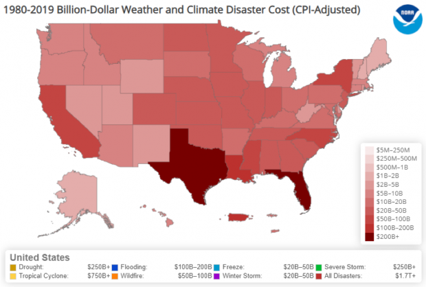 This map of U.S. states and Puerto Rico shows total estimated costs borne by each state from billion-dollar weather and climate disasters from 1980-2019. Screenshot from NOAA NCEI Billion-dollar Disasters webpage.