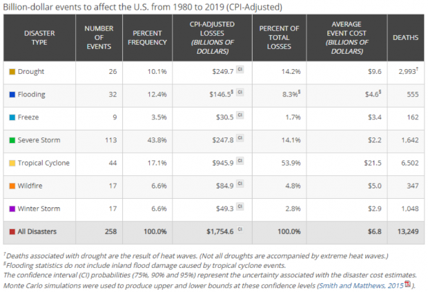 This table shows the breakdown, by hazard type, of the 258 billion-dollar weather and climate disasters assessed since 1980. Screenshot from NOAA NCEI Billion-dollar Disasters webpage.