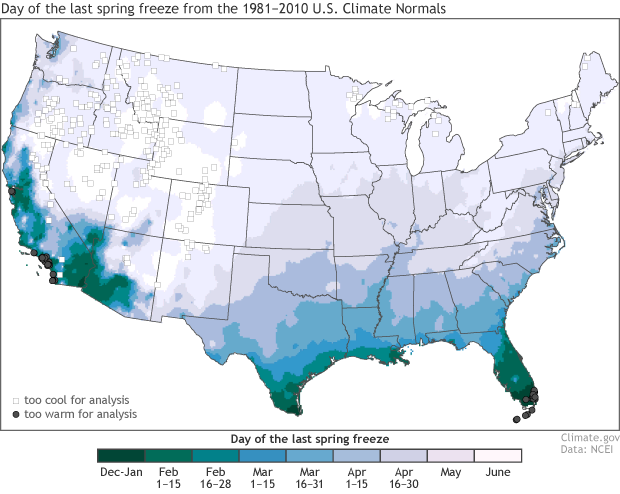 The average date of the last freeze of spring, with earlier-in-the-year dates in dark green and later-in-the-year dates in light purple. This map is based on the 1981-2010 Normals from the National Centers for Environmental Information. Map by Jake Crouch and Rocky Bilotta, NCEI.