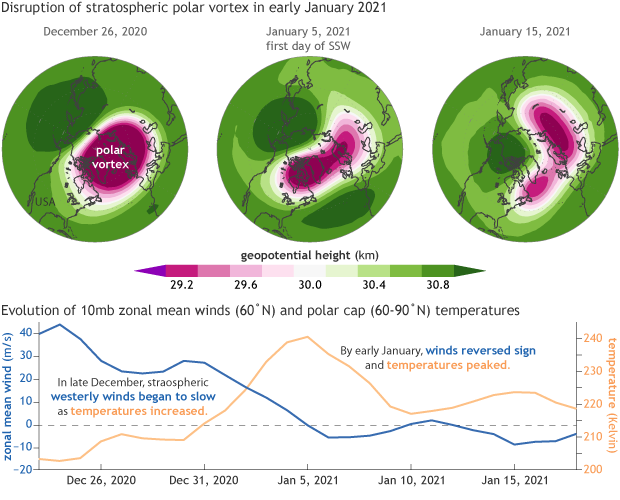 Evolution of the sudden stratospheric warming (SSW) in the stratospheric circulation. Top figures show 10 millibar (mb) geopotential heights for (left) December 26, 2020 as the polar vortex began to weaken, (middle) on January 5, 2021 when the stratospheric winds reversed sign and (right) on January 15, 2021 during the warming event. Bottom figure shows the evolution of the 100mb zonal mean winds (blue line; units in m/s) at 60°N and 10mb polar cap temperatures (red line; units in Kelvin) from December 15, 2020 through January 18, 2021. Figure courtesy of Lara Ciasto (NOAA CPC). Data from NCEP/NCAR Reanalysis.