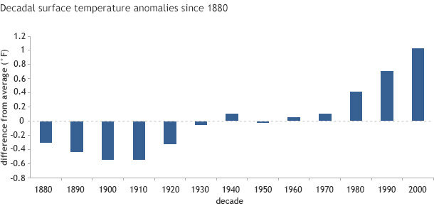 Surface temperature each decade since 1880 compared to the twentieth-century (1901-2000) average (dashed line at zero). Each of the last three decades was the warmest on record at the time, and each was warmer than the last. Data courtesy of NOAA’s National Climatic Data Center.