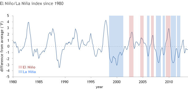 Graph showing the Oceanic Niño Index (difference from average sea surface temperatures in a key region of the tropical Pacific Ocean) from 1980-2012. Cooling La Niña events (blue shading) in the past decade have outnumbered warming El Niño events (red shading). Data courtesy of the NOAA Climate Prediction Center.