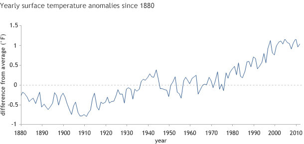 Yearly surface temperatures since 1880 compared to the twentieth-century (1901-2000) average (dashed line at zero). Since 2000, temperatures have been warmer than average, but they did not increase significantly. Data courtesy of NOAA’s National Climatic Data Center.