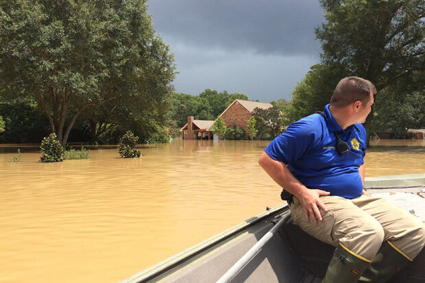 A Livingston Parish Deputy Sheriff surveys flood damage from a boat on August 15, 2016. Image courtesy the Rapides County Sheriff's Office.