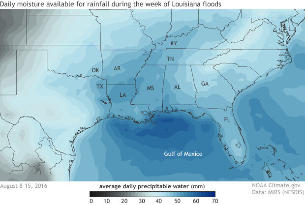 Average daily precipitable water values from August 8-15, 2016 as determined from satellite. Near record levels of moisture in the air along the Gulf Coast aided in creating the tremendous amount of rainfall which inundated southern Louisiana and Mississippi. Climate.gov image based on data from MIRS-NESDIS.