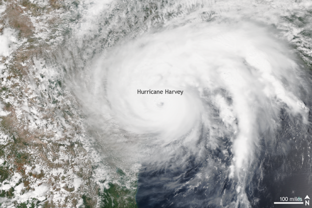 Suomi NPP satellite image taken of Hurricane Harvey on August 25, 2017 using the VIIRS instrument. Harvey made landfall in Texas as a category 4 hurricane. NOAA Climate.gov image using data provided by the NOAA Environmental Visualization Laboratory.