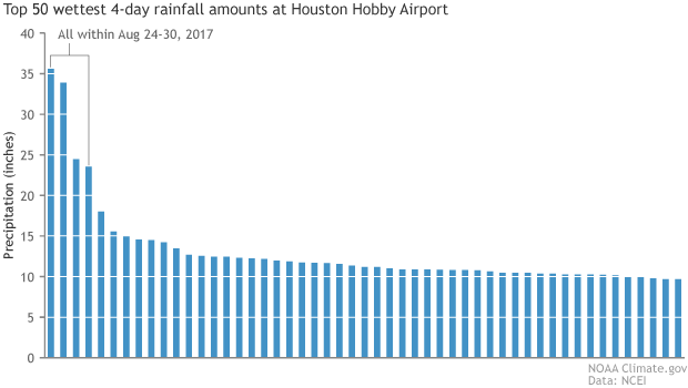 Ranking of the 50 wettest 4-day periods on record at Houston's Hobby Airport. The top four wettest 4-day periods all involve rainfall related to Hurricane Harvey. From August 26-29, 35.6 inches of rain at Houston's Hobby Airport setting the record for wettest 4-day period. It was nearly double the previous pre-Harvey record for 4-day rainfall. NOAA Climate.gov image using data the National Centers for Environmental Information.