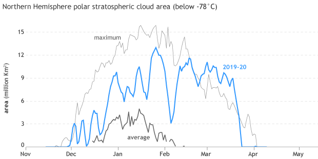 This graph shows the area of the lower Arctic stratosphere colder than -78° Celsius, the temperature required for polar stratospheric clouds (PSCs), in the winter and spring of 2019-20 (blue line) compared to the long-term average (dark gray line) and the maximum area observed on any day in the record (thin gray line). The PSC area was much above average throughout the winter, and was record-high from late February to late March. Graph by NOAA Climate.gov, adapted from originals by Craig Long, NOAA Climate Prediction Center.
