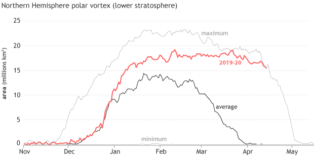In the lower stratosphere, where ozone destruction happens, the Northern Hemisphere polar vortex reaches an average size of about 14 million square kilometers in late January or early February. Throughout March it drops rapidly, and in an average year, it has disappeared altogether by April 1. This winter, it peaked at close to 19 million square kilometers in mid-February and remained at more than 15 million square kilometers through the middle of April. (Higher up, the final stratospheric warming event of the season usually comes in mid-April.)