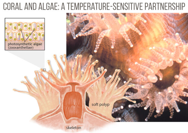 Coral are animals that partner with single-celled algae (zooxanthellae). During times of temperature or other stress, the collaboration can break down, causing the coral to expel their colorful symbionts. If harsh conditions persist too long, the bleached corals starve. NOAA Climate.gov graphic, using a photo by Brent Deuel, from NOAA Photo Library on Flickr.