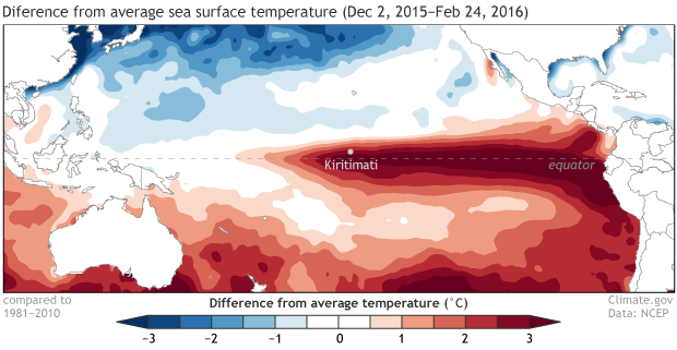 Averaged weekly OISST sea surface temperature anomalies for the Pacific Ocean starting on the week of December 2, 2015 through the week of February 24, 2016. A historic El Niño lead to well above-normal ocean temperatures across the central and eastern Pacific Ocean leading to extensive damage to the coral reefs around the island of Kiritimati. Climate.gov map with data provided by the National Center for Environmental Prediction.