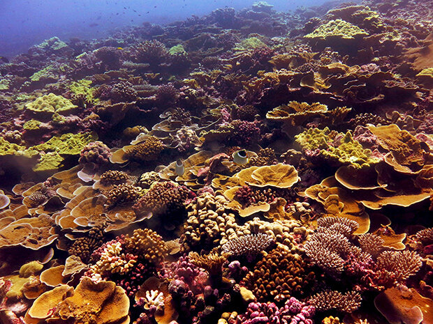A healthy reef at Kiritimati (Christmas) Island in the tropical North Pacific prior to the devastating bleaching event during the 2015-16 El Niño. Photo by Danielle Claar.