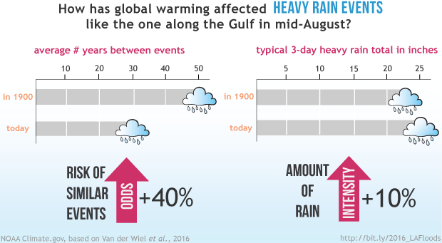 In mid-August 2016, a slow moving storm dumped more than two feet of rain in parts of southern Louisiana, forcing tens of thousands of people to evacuate and taking the lives of at least a dozen citizens. An attribution analysis found that the statistical return period for extreme rain events of that magnitude has dropped from an average of 50 years to 30 years due to global warming from greenhouse gases. And the amount of rain that would have fallen during a typical 30-year event in 1900 would have been 10% less than a similar event today, for example, 23 inches instead of 25. Graphic by NOAA Climate.gov, based on Van der Wiel, et al., 2016.